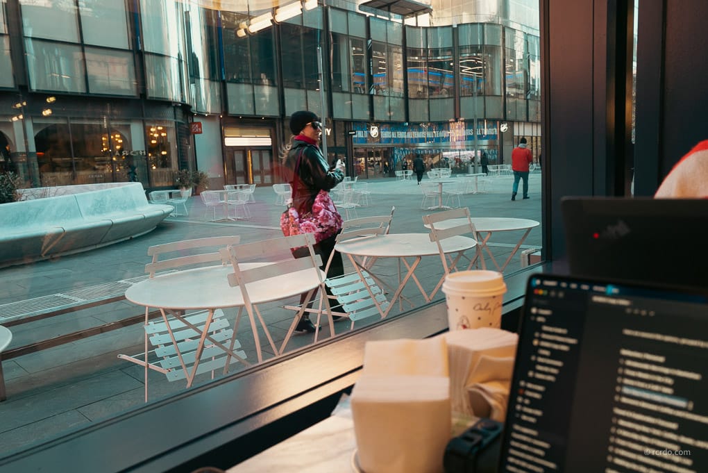 I am sitting at a table next to the window at Daily Provisions, a coffee shop in Manhattan near Hudson Yards. My wife, sitting in front of me, working on her business, laptop, ear pods, glasses on and everything. She is beautiful, and she looks very interesting when she is working.